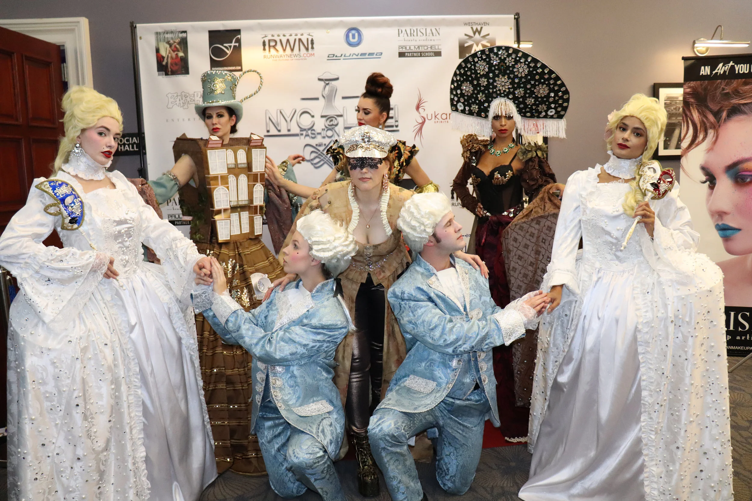 Inside, the theatrical team part of Madam Chebës opening act was preparing and practicing before their chance on stage, all the meanwhile the models were prepping! As everyone knows, events like this can become hectic just as much as they are filled with excitement. Once it came time for the show to start, the candelabra was set and the music played. Slowly one at a time, the two performers dressed in 18th century mens formal wear stepped out and added two more candles to the candelabra. A few breathtaking pauses and the female performers took their turns onto the stage. Interacting with each other before finally resting at their positions on the sides of the runway. The show has begun, and just as the first model stepped out, the men bowed, and the ladies curtsied.