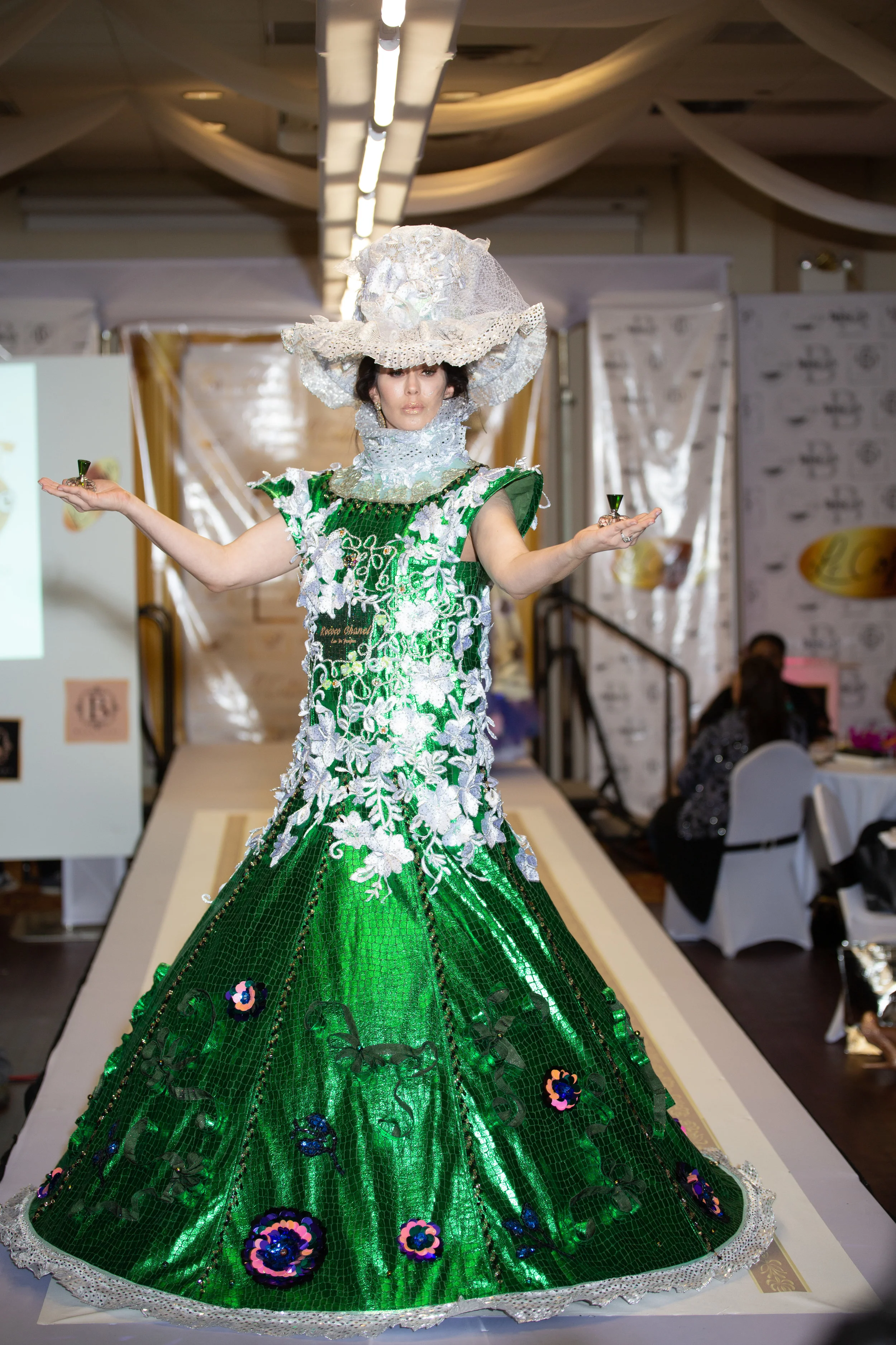 Then the magnificent Rococo bottle took the stage, holding two miniature bottles of her own in hand. By the way, anyone in the crowd receive a miniature perfume bottle from our models? That very scent is the representation of the design. A spice filled blend. We hope you enjoy the fantastic scent and got to experience the design on a whole other level.
